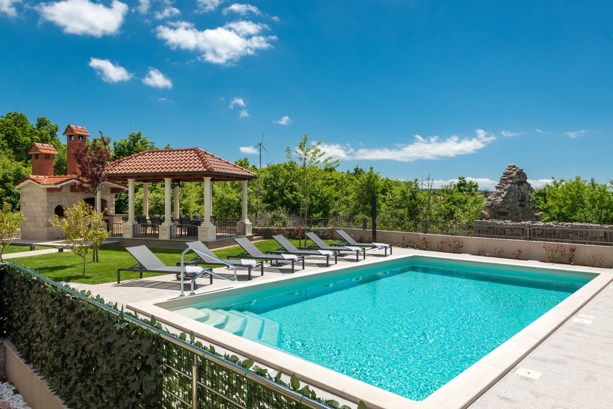 Villa features furnished terrace with BBQ facilities and private pool.